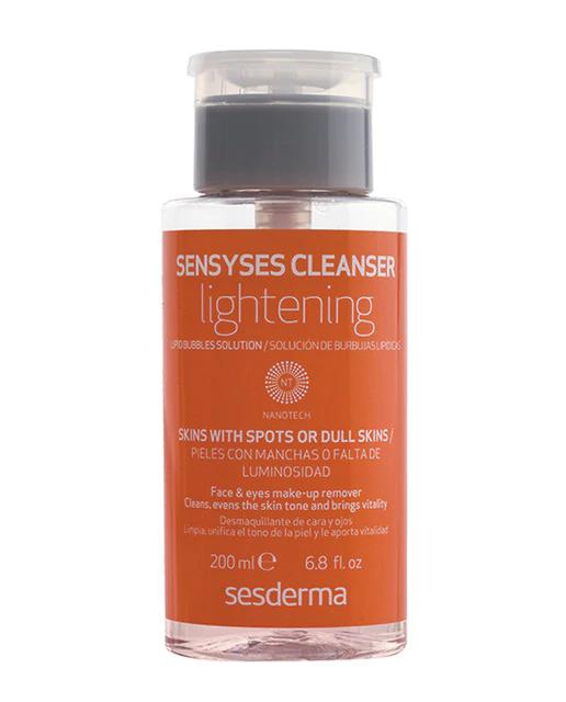 El Desmaquillante Cara/Ojos Sensyses Cleanser Lightening de Sesderma limpia y repara la piel con manchas cutáneas o falta de luminosidad. Gracias a su contenido en Azeloglicina, Liposomas de Vitamina C y 4-Butilresorcinol, así como un complejo de activos despigmentantes, unifica el tono de la piel y le aporta vitalidad. Ideal para piel con manchas o falta de luminosidad.